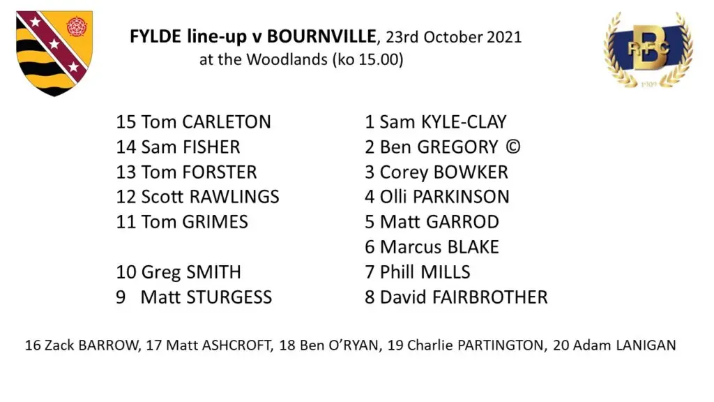 Fylde make 3 changes in their starting line-up v Bournville RFC at the Woodlands tomorrow (ko 3pm). Sam Fisher makes starting debut on the wing whilst David Fairbrother and Phill Mills return to the backrow. Good luck to everyone!