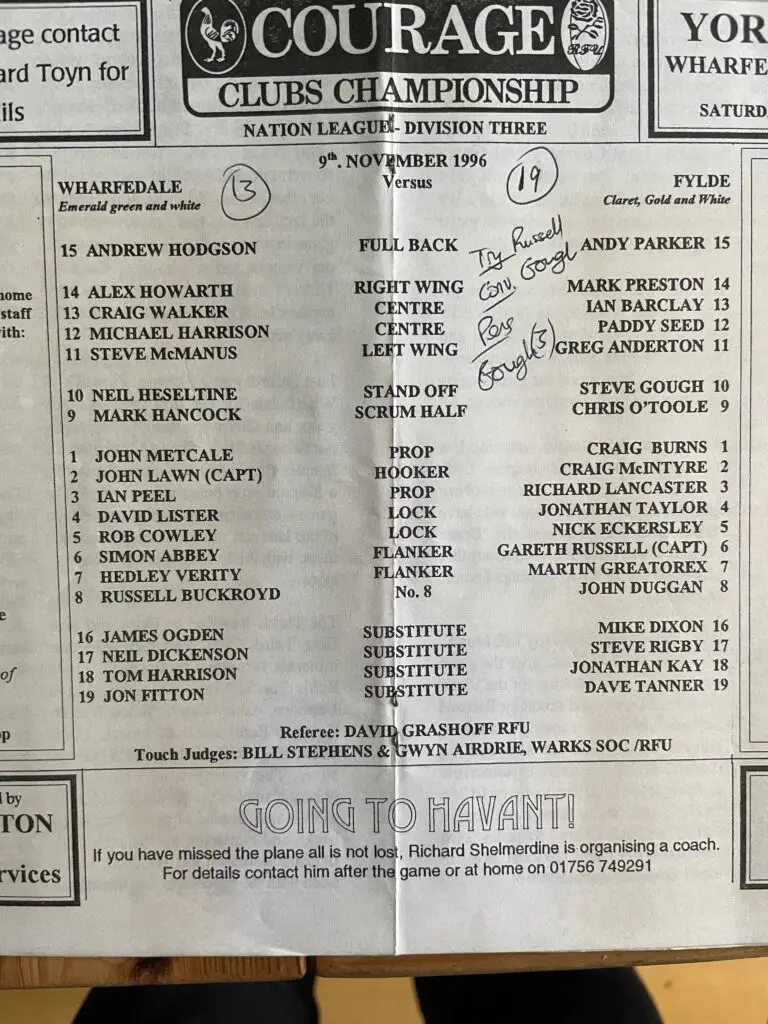 We’ve dug into the archive to find the Wharfedale match programme for Fylde’s first ever visit to the ground on 9th November 1996. The line-ups featured some very fine players on both sides. A close contest ended with Fylde edging home 13-19, thanks to a try by skipper Gareth Russell and a conversion and 3 penalties kicked by fly-half Steve Gough.