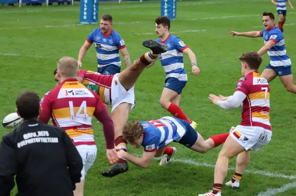 Moments of note in the first half were when the excellent Sheffield number 8, Ryan Burrows, picked up from the base of a scrum on his own 22, rampaged up the blind side and freed his winger to take play deep into Fylde’s 22 before the move was snuffed out. Fylde’s best moment came when a slick move saw Connor Wilkinson give Tom Carleton what looked like enough space to dive into the corner. Dive he did, but a superb intervention by the last Sheffield defender forced the ball loose at the last moment. The running and tackling by both sides was fierce and fearsome, one colossal contact saw Fylde skipper Ben Gregory bounce off Sheffield’s man of the match Burrows and somehow right himself and go back for more. How he didn’t end up dazed and running towards his own line is anyone’s guess.