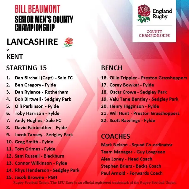 Lancashire Rugby make four changes in their starting line-up for the Bill Beaumont County Championship Final v Kent Rugby at Twickenham on Sunday (28th May) – Sedgley Park’s Rhys Henderson, Jacob Tansey & Bob Birtwell return, plus Sale FC’s Andy Hughes is named at 7. Oli Trippier (‘Hoppers) & Oscar Crowe (Sedgley) return to the bench.