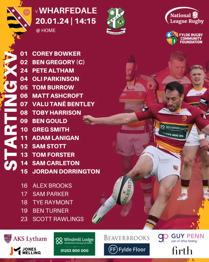 4th placed Fylde make four changes in their starting line-up for the visit of fifth placed Wharfedale RUFC to the Woodlands on Sat (ko 14.15). Corey Bowker returns to front row together with Pete Altham against his old Club. Matt Ashcroft is at blindside flanker. In the backs, Tom Forster is back at centre. Fylde look for their 6th successive victory in National League Rugby N2(N).
