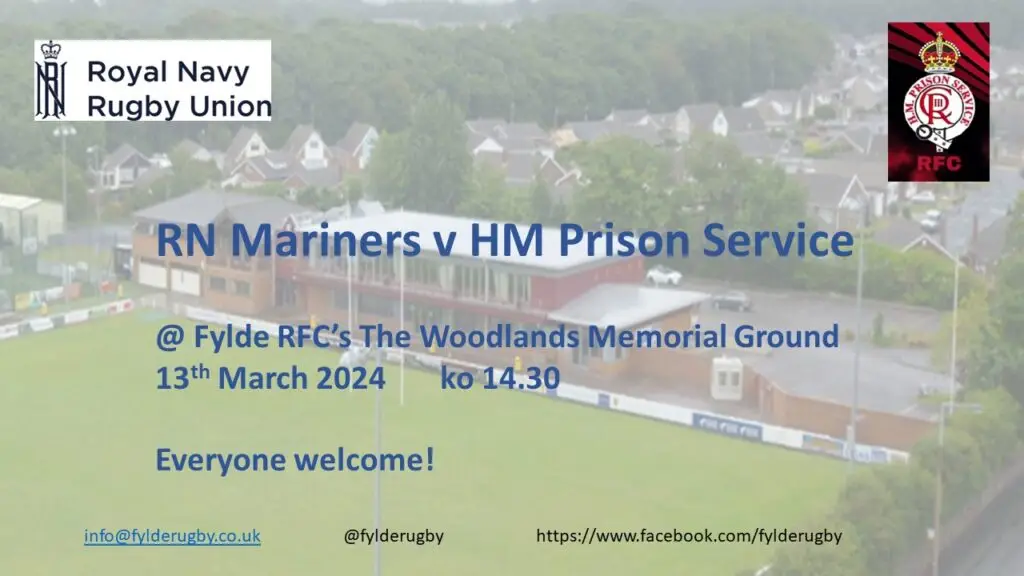 Fylde RFC is proud to host a fairly unique occasion at its famous Woodlands Memorial Ground, the first ever visit by the Royal Navy’s Veterans team, the Mariners, who take on His Majesty’s Prison Service XV on Wednesday, 13th March (ko 14.30). Free entry, everyone welcome!