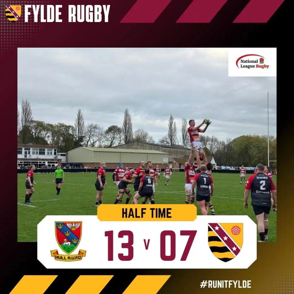On a mild, dry and still day there was no playing with or against the elements, and Hull kicked off to the visitors. An early knock on by Fylde gave Hull the scrum from which they forced a penalty which full-back Fynlay Hobson knocked over to give them a 3-0 lead. Fylde foraged up field for the first time only to knock on again and this time on his own 10-yard line scrum half Sam Crane picked and went blind. He brushed off the attempted tackle and set winger Peter Hudson-Kowalewicz free, who drew the last man and put number eight Adam Brankley in for the try, unconverted but with only 8 minutes gone Fylde were the same number of points down.