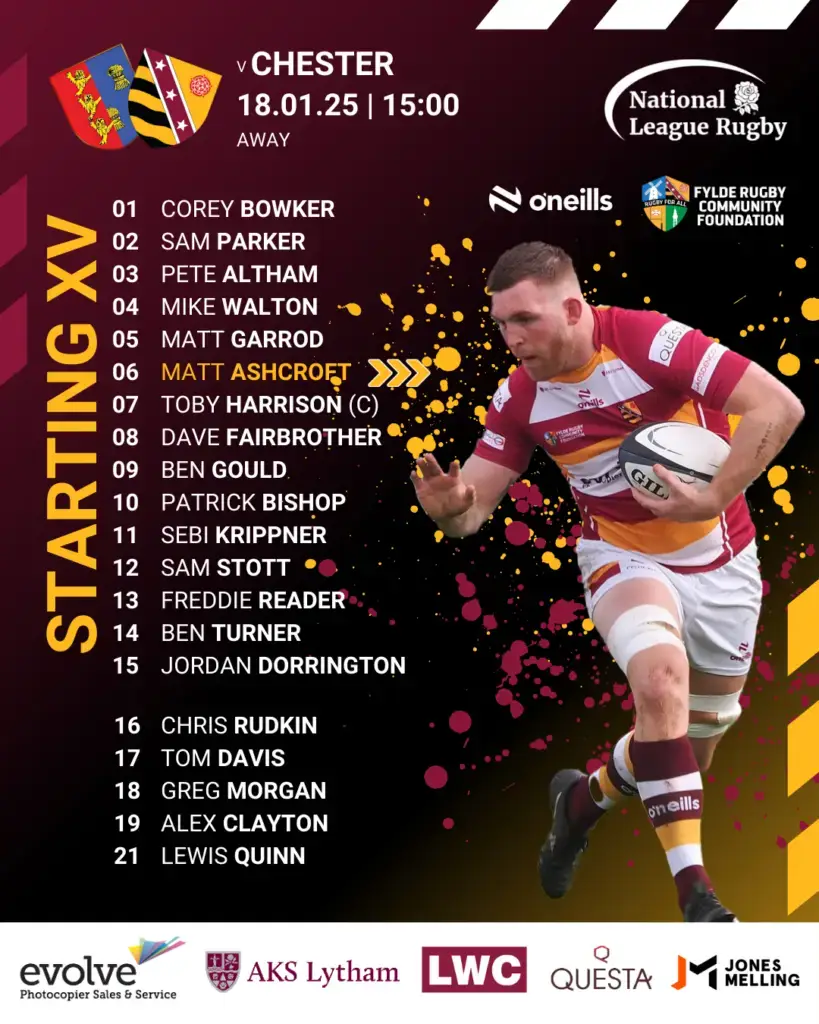Fylde make three changes in their starting line-up for their visit to Chester RUFC on Saturday (ko 15.00). Sam Parker is named at hooker and Matt Ashcroft is at blindside flanker.