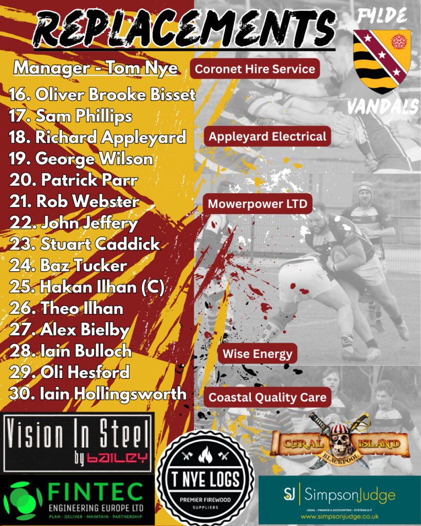 Apologies for late notice of the Vandals squad that will face East Manchester RUFC at the Woodlands this afternoon (ko 15.00). Good luck lads!